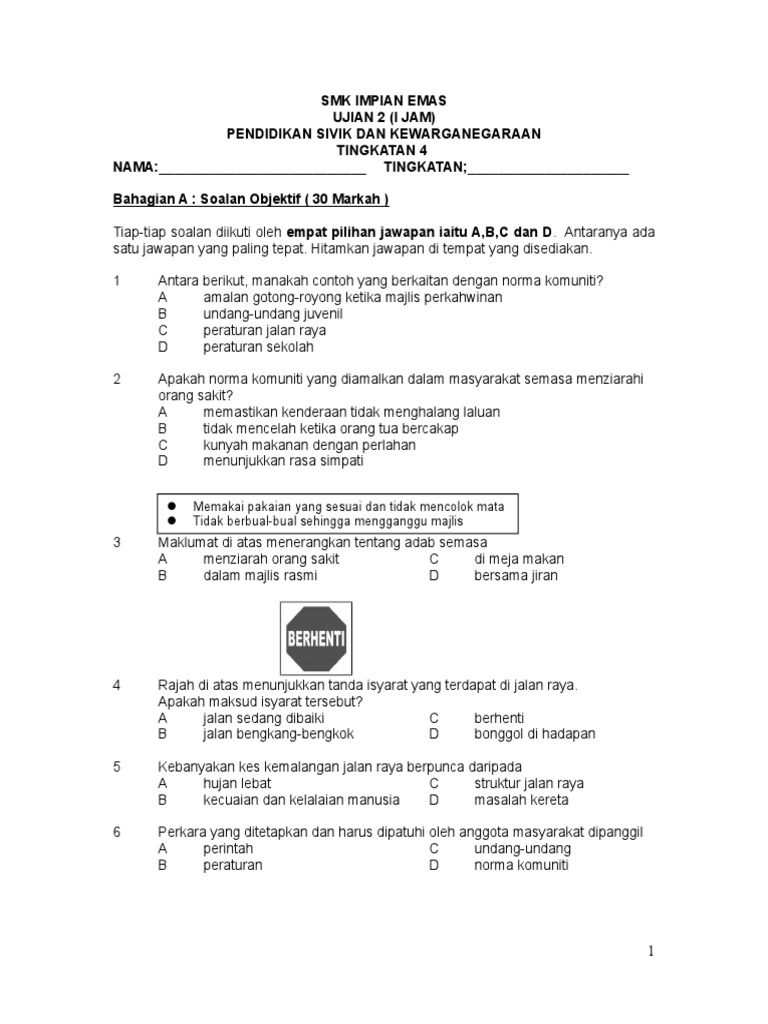 Smk Impian Emas Ujian 2 I Jam Pendidikan Sivik Dan Kewarganegaraan Tingkatan 4 Nama Tingkatan Bahagian A Soalan Objektif 30 Markah