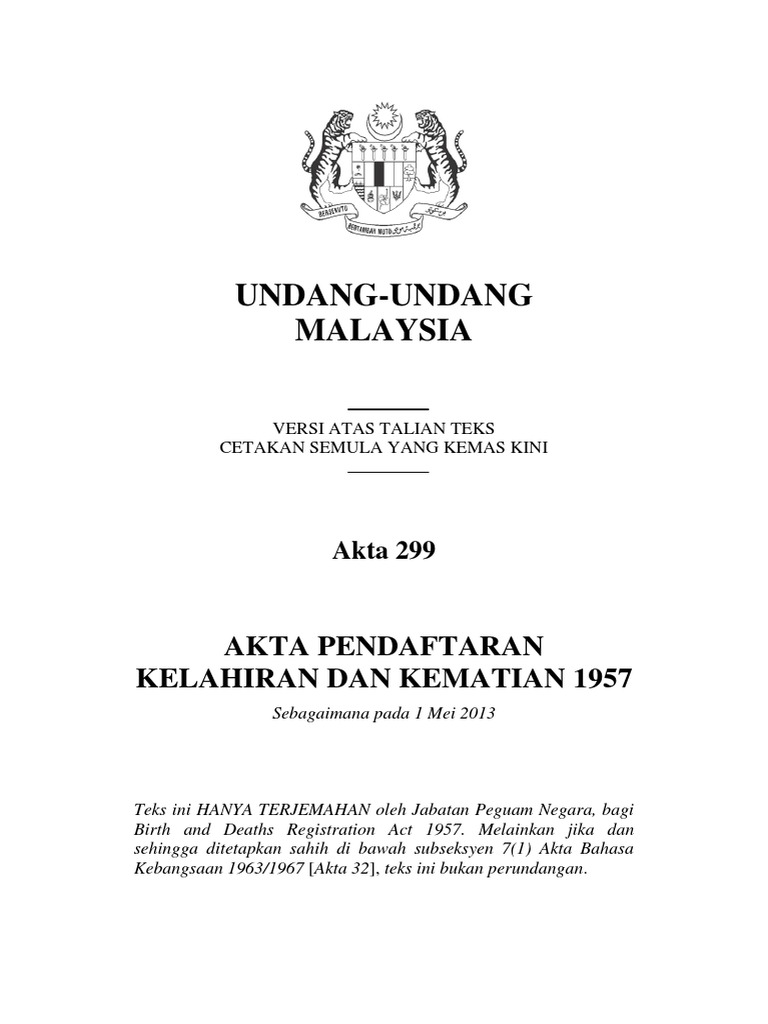 1 ogos 1958 bahagian i permulaan tajuk ringkas dan pemakaian 1. 1 akta ini bolehlah dinamakan akta pendaftaran kelahiran dan kematian 1957. Akta 299 akta pendaftaran kelahiran dan kematian 1957 suatu akta berhubungan dengan pendaftaran kelahiran dan kematian. Tarikh kelahiran hari bulan tahun.