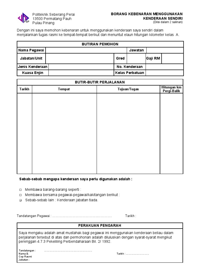 Kenderaan pegawai menggunakan bukan kenderaan sendiri semasa menjalankan tugas rasmi. 3 borang kebenaran menggunakan kenderaan sendiri perjalanan melebihi 240 km tambang gantian rujuk rtm tnt 01 kecuali pemandu pembantu operasi 4 i penyata touch n go bagi yang menggunakan kad tng ii resit tol bagi yang tidak menggunakan kad tng 5 laporan kehadiran pegawai bertugas kad perakam waktu. Borang kebenaran menggunakan kenderaan sendiri diisi dalam 2 salinan title. Dengan ini saya memohon kebenaran untuk menggunakan kenderaan saya sendiri dalam menjalankan tugas rasmi ke tempat tempat berikut dan menuntut elaun hitungan kilometer kelas a.