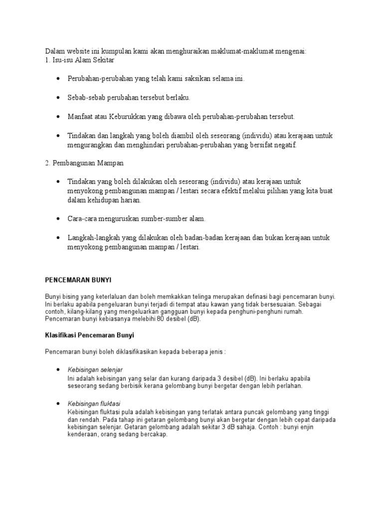 Penyebab dampak dan cara mengatasi pencemaran bunyi suara polusi suara atau pencemaran suara adalah gangguan pada lingkungan yang diakibatkan oleh bunyi atau suara yang mengakibatkan ketidaktentraman makhluk hidup di sekitarnya. Keadaan ini disebabkan oleh pelbagai kelemahan dan kekangan dalam melaksanakan langkah langkah tersebut. Punca punca berlakunya pencemaran bunyi adalah seperti pembangunan dalam kawasan industri dimana bunyi yang bising akan dikeluarkan melalui pemprosesan material jentera dan kenderaan aktiviti pembuatan ini secara tidak langsung akan menjejaskan ketenteraman orang ramai dan memberi kesan gelisah kurang rehat gangguan pemikiran dan lain lain atas pencemaran bunyi yang dikeluarkan. Langkah langkah mengatasi pencemaran bunyi a penggunaan teknologi terdapat pelbagai strategi mengurangkan pencemaran bunyi antaranya ialah penggunaan halangan bunyi menghadkan kelajuan kenderaan menukar tekstur permukaan jalan raya menghadkan berat kenderaan mengunakan kawalan trafik agar tidak mengalami tekanan brek dan pecutan bagi kenderaan.