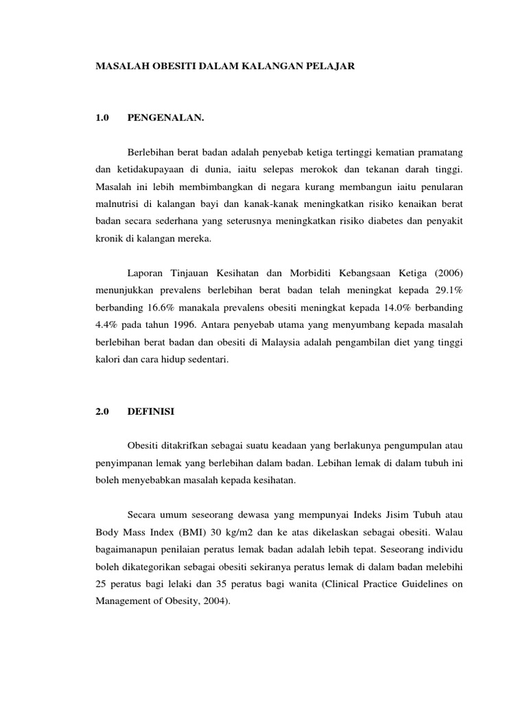 Mengikut laporan akbar peratusan rakyat malaysia yang mempunyai berat badan yang berlebihan ini adalah lebih tinggi berbanding dengan negara negara asia yang lain. Cara cara untuk mengelakkan diri daripada masalah obesiti.