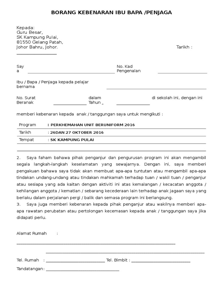 Contoh Surat Kebenaran Ibu Bapa Untuk Menyertai Program